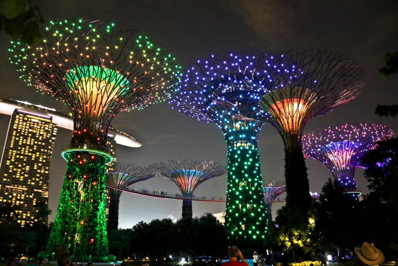 A huge, colourful, futuristic park in the bay area of Singapore, it spans a total of 101 hectares of prime land at the heart of Singapore's new downtown - Marina Bay. Gardens by the Bay has some massive artificial trees joined by a sky walking bridge and two huge glass greenhouse botanical gardens the Cloud Forest and Flower Dome. Both the glass conservatories are air conditioned. Cloud Forest (smaller dome) is a glass conservatory comprising of plants that are native to mountainous regions which are 1000 to 3500 meters above sea level. Within the enclosed compound, a 35-metre tall mountain is veiled in mist and covered in lush vegetation amidst the high indoor waterfall. The Flower Dome (bigger dome) is a glass conservatory with a selection of plants from the Mediterranean and semi-arid subtropical regions like Australia, Central Chile, California and South Africa.